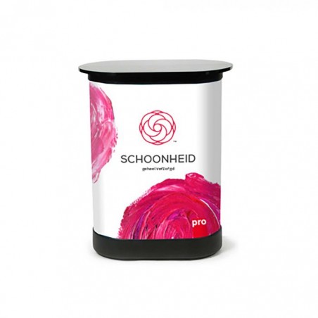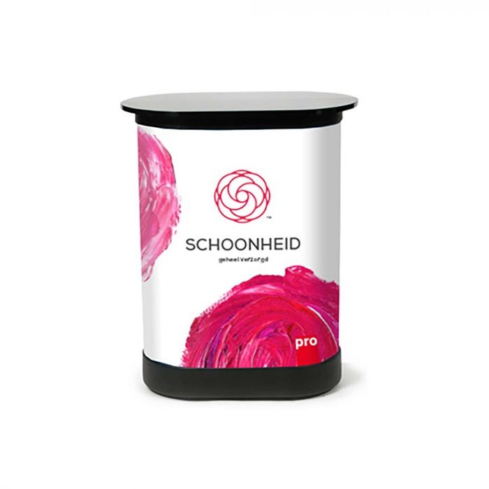 De transportkoffer-print is speciaal ontwikkeld voor de koffer van de gebogen pop-up wand. Die koffer gebruik je sowieso al om frame, banen en accessoires veilig te vervoeren. Door er een bedrukte print omheen te zetten, verandert hij in een herkenbaar aanspreekpunt op de stand: ideaal als plek voor folders, inschrijfformulieren of een kort kennismakingsgesprek. In combinatie met het optionele topblad creëer je zo met één extra print een volwaardige beursbalie, perfect passend bij jouw beurswand.
