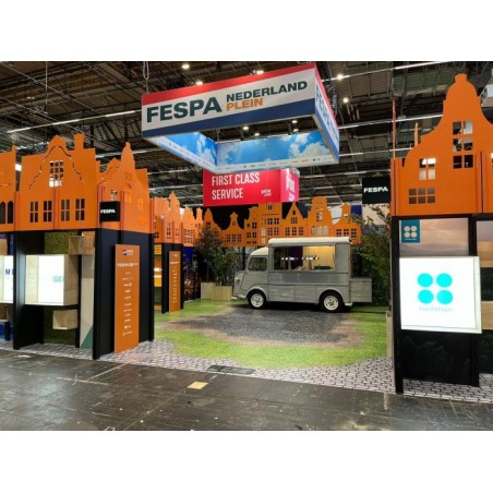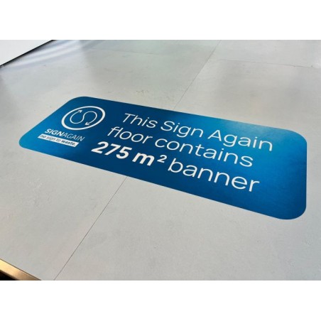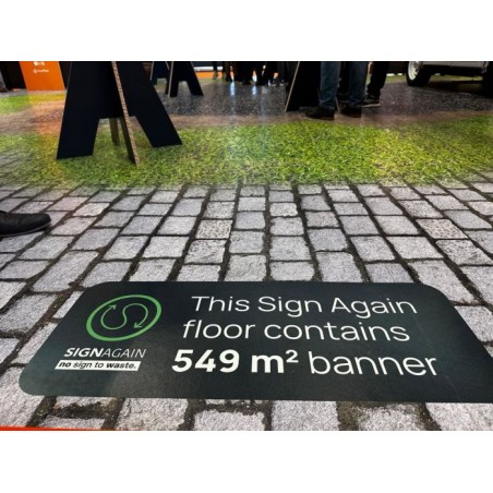 De Sign Again vloer is de duurzame basis voor je beursstand of tijdelijke presentatie. Deze bedrukte beursvloer bestaat uit stevige, circulaire platen die zijn gemaakt van gerecycled signmateriaal en weer volledig recyclebaar zijn. Je laat de bovenkant full colour bedrukken met jouw ontwerp en loopt vervolgens over een strakke, professionele vloer die perfect aansluit op je wanden en balie. Dankzij de slijtvaste antislipcoating voelt de vloer veilig en solide, ook in drukke looproutes.