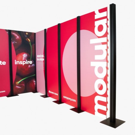 De panelen worden doorgaans gemaakt van stevige plaatmaterialen rond 10 mm dik, zoals Forex®, Re-board, Dibond® of plexiglas. Die worden full colour bedrukt met jouw huisstijl, campagnebeeld of productfoto’s. Dankzij het inhaaksysteem blijven de platen strak en stabiel staan, terwijl je ze voor een volgende beurs eenvoudig kunt vervangen door een nieuwe set. Zo blijft de stand er telkens fris en actueel uitzien, terwijl je de constructie hergebruikt.