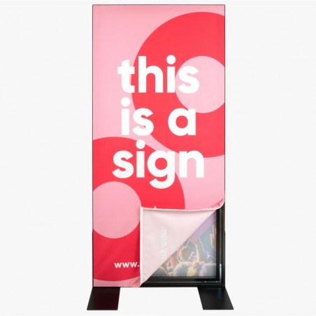 Het doek zelf wordt in full colour geprint op textiel met een pees rondom. Denk aan materialen als Dekostof met een matte, kleurechte uitstraling of een blokkerend doek zoals Blackback Soft als je geen licht of achtergrond erdoorheen wilt zien. De pees rondom druk je eenvoudig in de sponning van het frame, waardoor het doek mooi strak trekt. Voor een nieuwe actie of campagne bestel je simpelweg een nieuw doek; het bestaande frame blijft staan. Zo kun je met één vrijstaand textielframe het hele jaar door variëren in boodschap, zonder telkens een compleet nieuwe beurswand aan te schaffen.