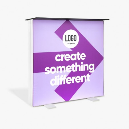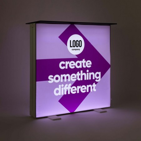 De Pixlip Go balie is ontworpen als praktische werkplek én lichtobject in één. De counter bestaat uit een 100 × 100 cm frame met een frame-diepte van circa 150 mm, voorzien van LED-modules in de basis en een stevig topblad. De verlichting verspreidt het licht egaal over de beide textieldoeken, zodat je boodschap ook in een drukke, donkere beursomgeving helder en gelijkmatig uitlicht. Je kunt aan beide zijden dezelfde print gebruiken voor maximale herkenbaarheid, of juist per zijde een andere boodschap tonen – bijvoorbeeld merkbeeld vooraan en productinformatie of QR-code aan de achterkant.