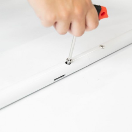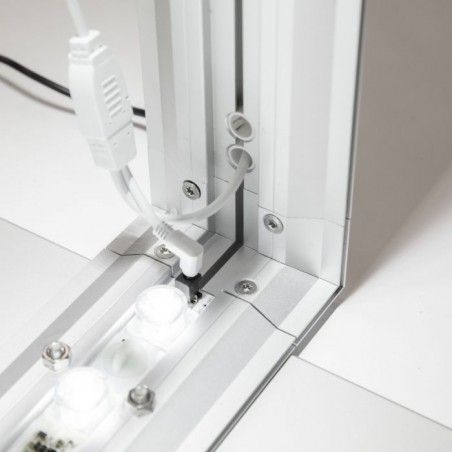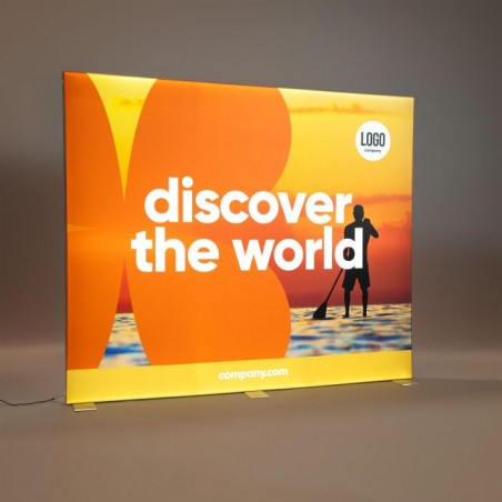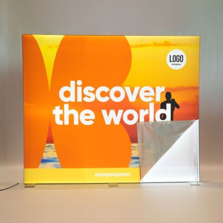 Een LED beurswand is dé oplossing als je echt wilt opvallen op de beursvloer. In plaats van een gewone, niet-verlichte achterwand krijg je een grote, strak afgewerkte aluminium wand waarin LED-verlichting is geïntegreerd. Aan beide zijden span je een backlit textieldoek met jouw ontwerp, zodat je boodschap van alle kanten oplicht. De kleuren ogen diep en levendig, details blijven goed zichtbaar en ook in een drukke hal met wisselend licht blijft je merk helder in beeld. De complete set wordt geleverd in een stevige koffer op wielen met alle onderdelen en doeken erbij; op locatie bouw je de wand in stappen op tot een professionele, verlichte eyecatcher.