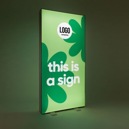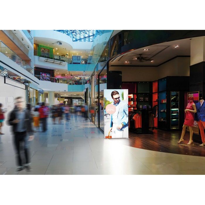 Een Pixlip Go frame is een dubbelzijdig verlicht alternatief voor de klassieke banner of beurswand. In plaats van een ‘platte’ print op doek of PVC kijk je hier tegen een moderne lichtbak aan, met aan beide kanten een backlit textielprint. Je kunt aan beide zijden dezelfde visual gebruiken voor maximale herkenning, of juist twee verschillende boodschappen tonen: bijvoorbeeld merkbeeld aan de ene kant en productactie of route-aanduiding aan de andere kant. Zo haal je het maximale uit een vrijstaande display midden in je stand, showroom of etalage.